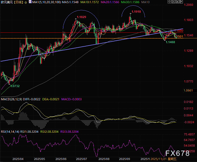 汇通财经APP讯——周五(11月21日)亚欧时段欧元兑美元走出小幅冲高,之后回落的走势,昨晚偏向消极的美国非农发布后欧元获得喘息机会,今天亚市时段走出温和冲高的反弹走势但随着欧元区和欧洲多国制造业PMI数据的公布,欧洲三大股指集体下跌,同时欧元兑美元大幅回落,自1.1551的高点回落近40个点,由涨转跌收出长上影线,目前交投于1.1514附近。