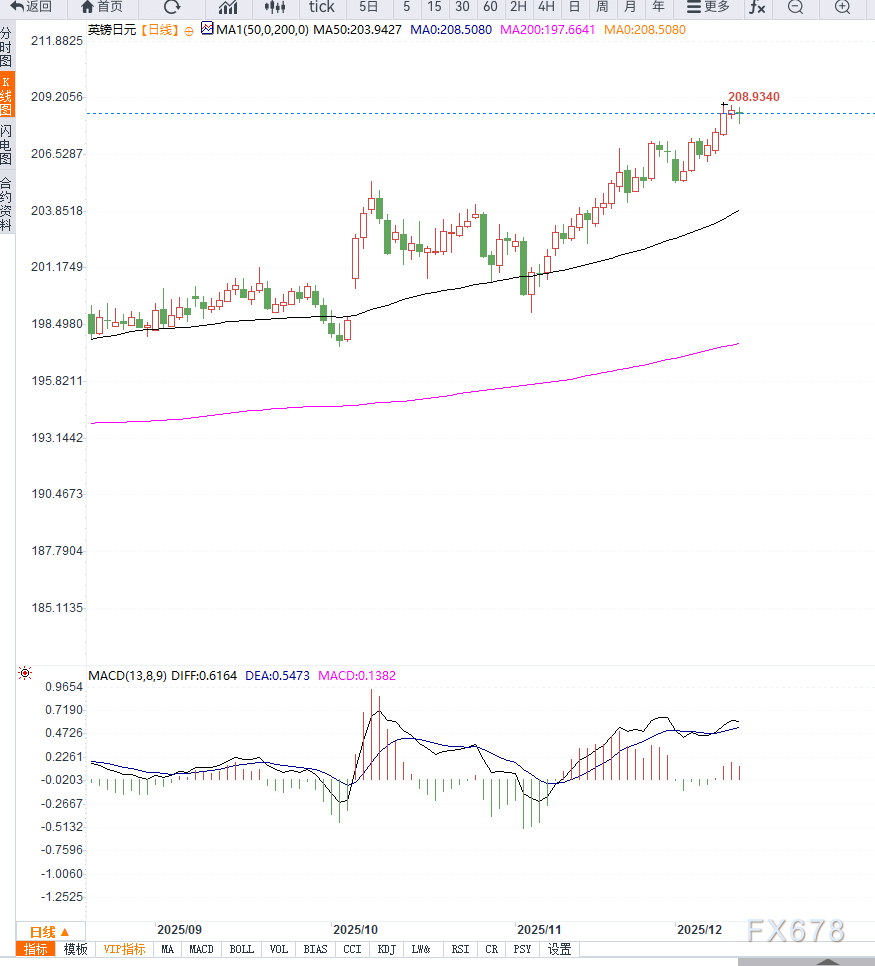 技术面上,GBP/JPY仍处于高位整理结构,短线支撑集中在:207.80区间:关键买盘区,跌破后或引发技术性回调;