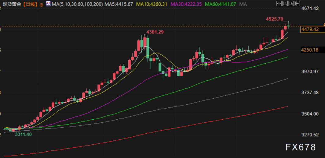 现货黄金周三早盘突破每盎司4500美元关键关口,创下4525.18美元的纪录新高,随后回吐涨幅,2月交割的美国期金收低0.1%,结算价报4502.8美元。