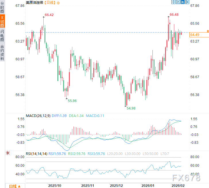周三亚市时段,受美伊持续地缘政治风险影响,美原油价格震荡走强,现交投于每桶64.50美元附近,日内涨幅约0.8%,此前一个交易日油价震荡走低,收跌0.34%。